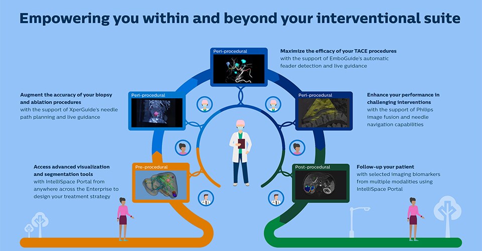 Onco suite provides a comprehensive solution for planning and guidance of embolization, as well as for biopsy and ablation procedures. Onco suite is a combination of the Azurion Image Guided Therapy platform with its interventional solutions, workflow options, education and services. It supports interventional oncology teams in the detection and treatment of multiple lesions by offering high spatial and contrast resolution with advanced image guidance. This is designed for consistency and precision to allow for superior care and confident performance.